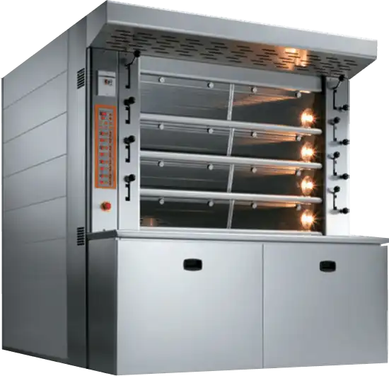 Shelves rotate around a central shaft powered by an external motor, mimicking the motion of a Ferris wheel. This ensures that all items receive uniform heat distribution, resulting in consistent quality.