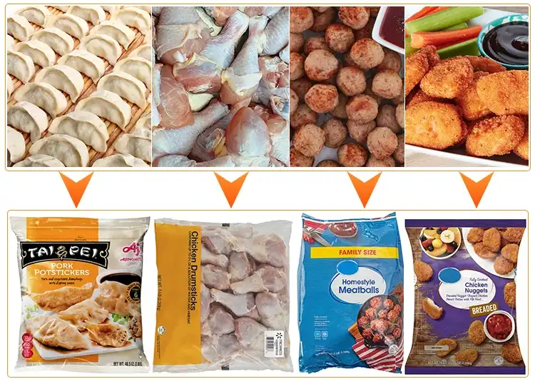 Frozen food: food packaging machine is widely used in the frozen food industry. They can automate the packaging process of frozen food products, such as packaging and sealing frozen vegetables, frozen fruits, frozen meat products, etc., to maintain the freshness and quality of the food.